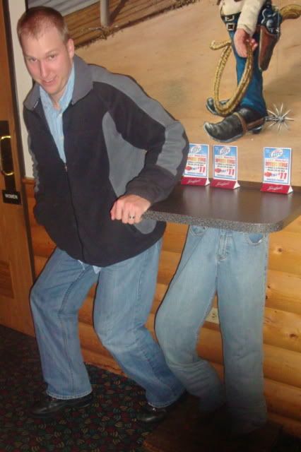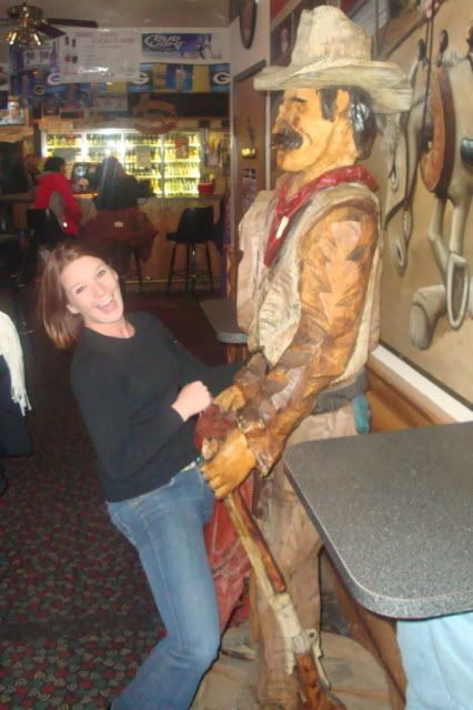 We took these at a western bar outside of the Dells–after a couple beers as I’m sure you can guess. Pic 1 is G posing with a table that just so happened to double as his jeans twin, and pic 2 is a statue of a cowboy holding a saddle at his side…which I decided to hop on. It’s not a “couple shot” but it’s the best I can do!