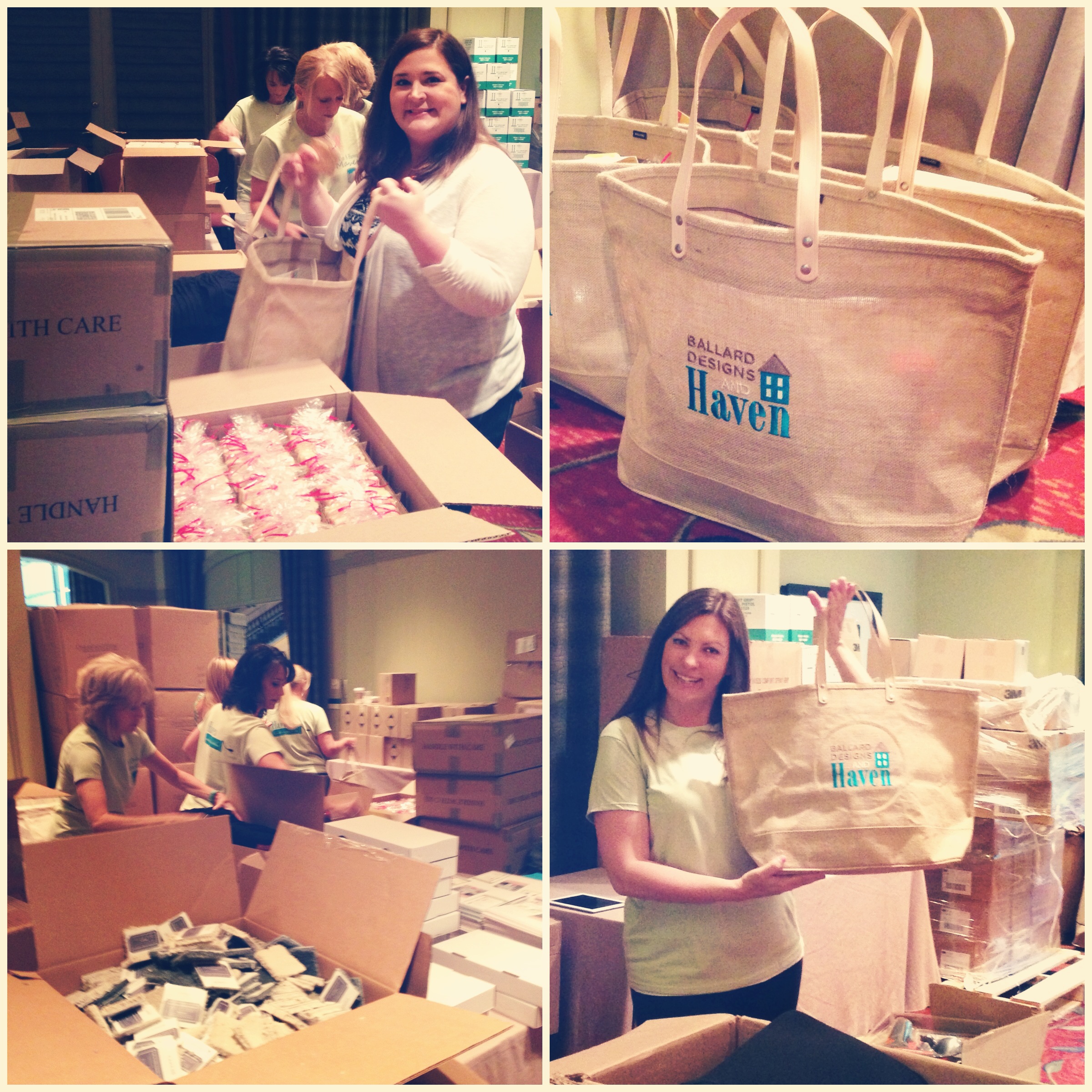 Beth and I set our alarm for 8:30am, and by 9am I was pony-tailed, mascared, swag bag filling fool.  Check out these gorgeous burlap bags we received compliments of Ballard Designs!  (Not only did it come in handy all throughout the conference, but it also saved me $90 in overweight luggage charges when I pulled it from my suitcase, filled it with some of my packed items to lighten my load and used it as my carry-on for my flight home – thank you, Ballard!)