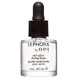 Sephora by OPI Nail Color Drying Drops. Just a drop leaves your nails dry to the touch in 1 minute, and completely dry in 5. Up to this point I’ve been using OPI’s RapiDry Top Coat polish, but half-way through the bottle it gets all thick and gunky, and painting it on has messed up my nail color a time or two. So far I’m loving these drops–much easier to manage than the brush!