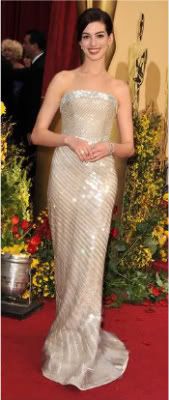 I was loving all the pale dresses of the evening–Marisa Tomei, Evan Rachel Wood, SJP, and even Tina Fey. But my hands-down favorite look of the evening went to my newest love–Anne Hathaway. Now she may not have taken home the Oscar, but over this past year this gal skyrocket from my Do Not Call List to my Christmas Card List. And she may or may not have made a few movies somewhere in there. Anne–I love you. Come visit me anytime! (Bring the dress.)