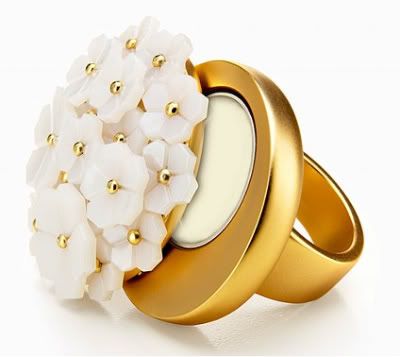 I just picked up this Dream Angels Heavenly Bloom Ring from Victoria’s Secret, and I have to admit–it’s a little piece of heaven. It’s so pretty topped with a cluster of pearlized gold-dotted flowers, but slide that top and you’ll find a little pot of Heavenly Bloom solid perfume inside!