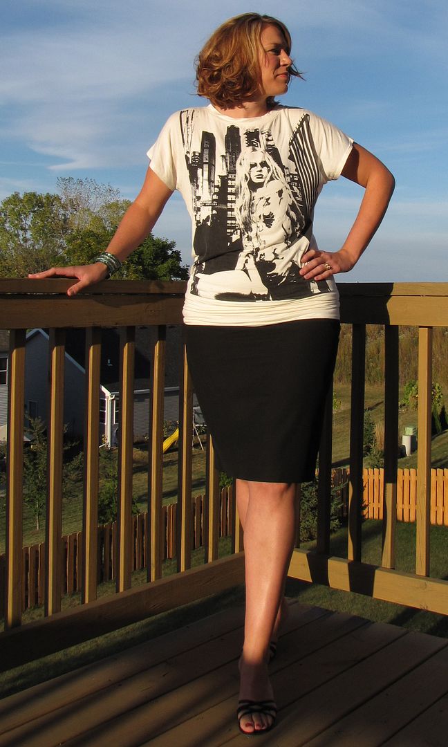 My friend Jamie looked fabulous as always, so I decided she needed to get in on the fashion show action. She paired a fitted graphic tee with a sleek pencil skirt–love it!